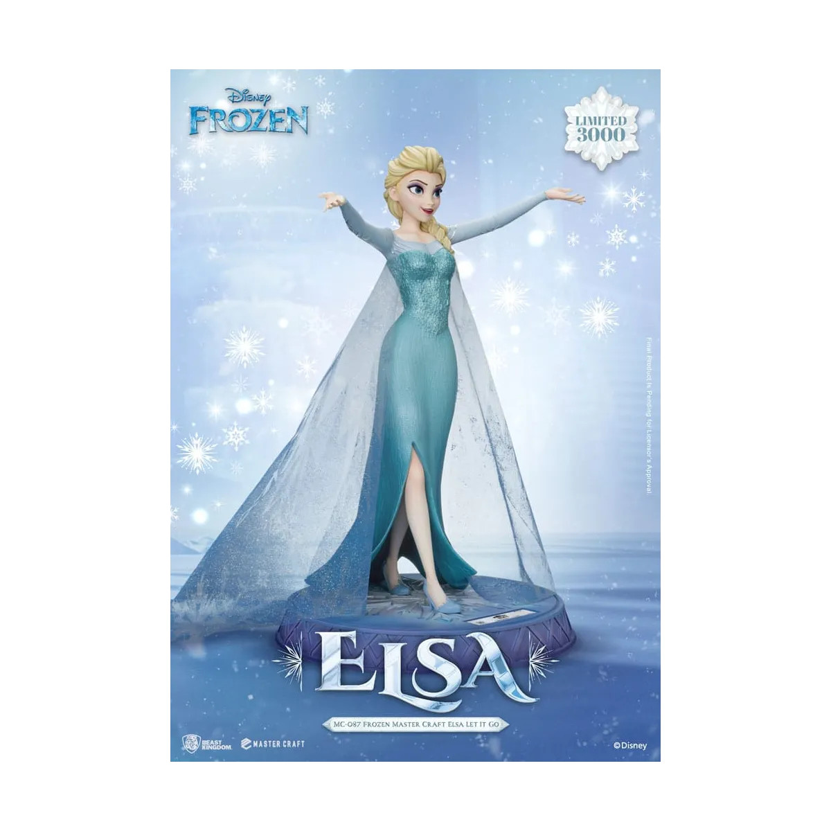 Voila une superbe Elsa en train de chanter ce qui fera de la Reine des Neige un Disney culte, le celebre Let it go! (Libérée, Délivrée chez nous). Haute de 40cm sur sa base, cette Elsa est aussi bien sculptée que fidele a ce passage du dessin animé, dans son dos un joli voile diaphane ajoute a l'esthetique de la statue pour un rendu etincellant.