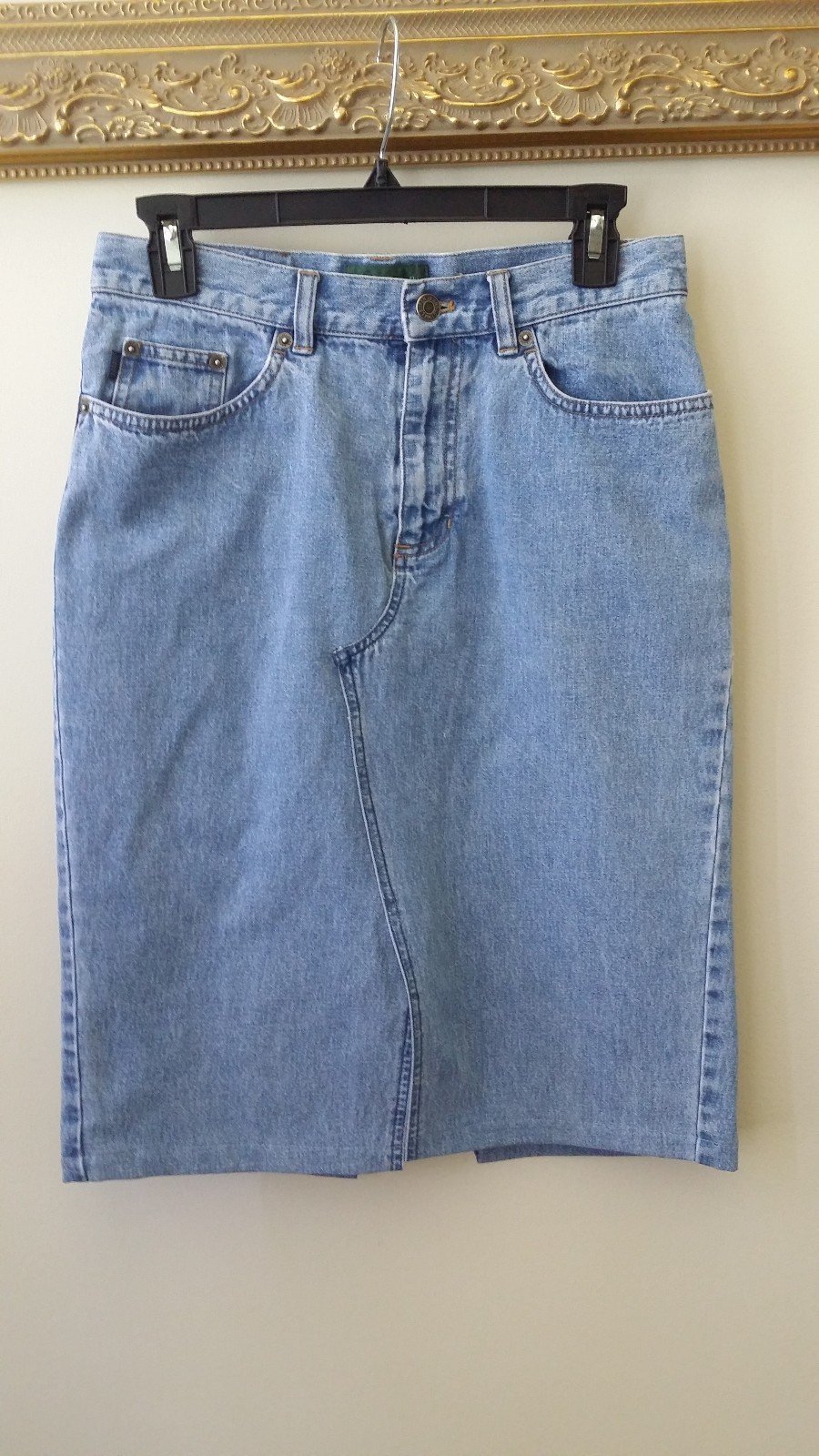 Reconstructed Jean Skirt. Every reconstructed denim item that I make is one-of-a-kind. I made this skirt from a pair of old jeans. I designed this skirt with a slit in the front and one in the back.