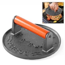 ●POURQUOI EN FAIT ? | Grâce à son poids de 1,0 kg, le presse-viande de presse vos aliments contre la grille ou la plaque de cuisson. Vous évitez ainsi les steaks et burgers bombés au centre et secs sur les bords. QUALITÉ | Le presse-burger de 1 kg est moulé en une seule pièce de fonte. Seule la poignée en bois a été montée. La presse à steak s'utilise aussi parfaitement lorsque le capot du barbecue est fermé. POSSIBLE D'UTILISER IMMÉDIATEMENT | Le presse à hamburger est déjà brûlé (preseasoned) et peut être utilisé immédiatement. Placez vos aliments sur votre barbecue sphérique, votre barbecue à gaz ou votre barbecue au charbon de bois, puis placez le lest.