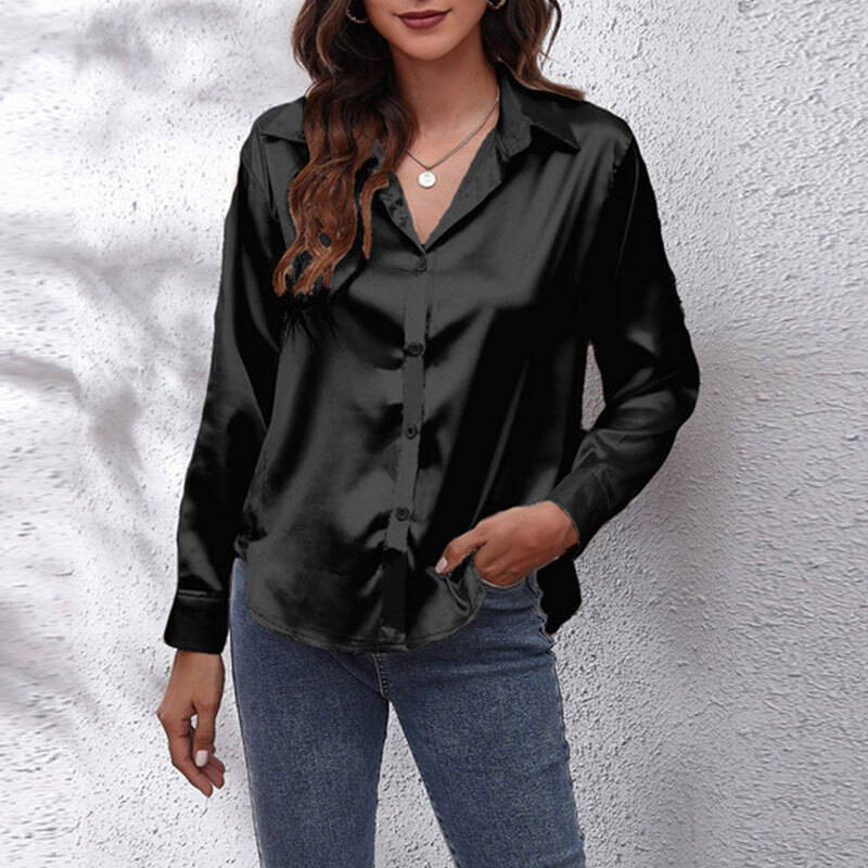 Chemisier de travail boutonné à manches longues, poignets boutonnés, col rabattu, style basique. Hauts de chemise soyeux adaptés au travail, au bureau, aux vacances, à la vie quotidienne et aux sorties.