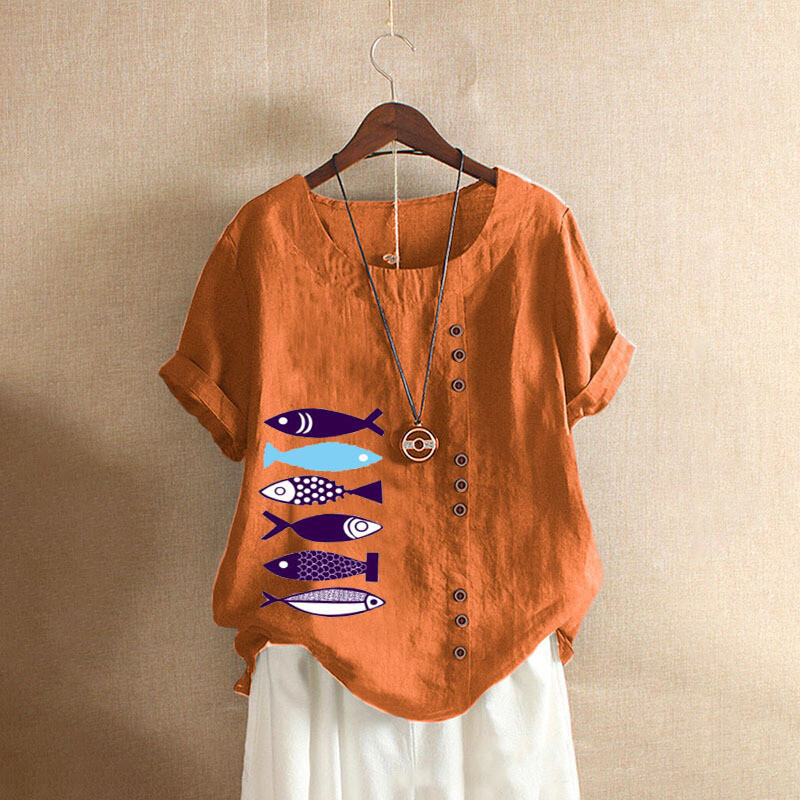 Coton Lin Femmes Manches Courtes T-Shirt Décontracté Lâche Imprimé Chemisier /