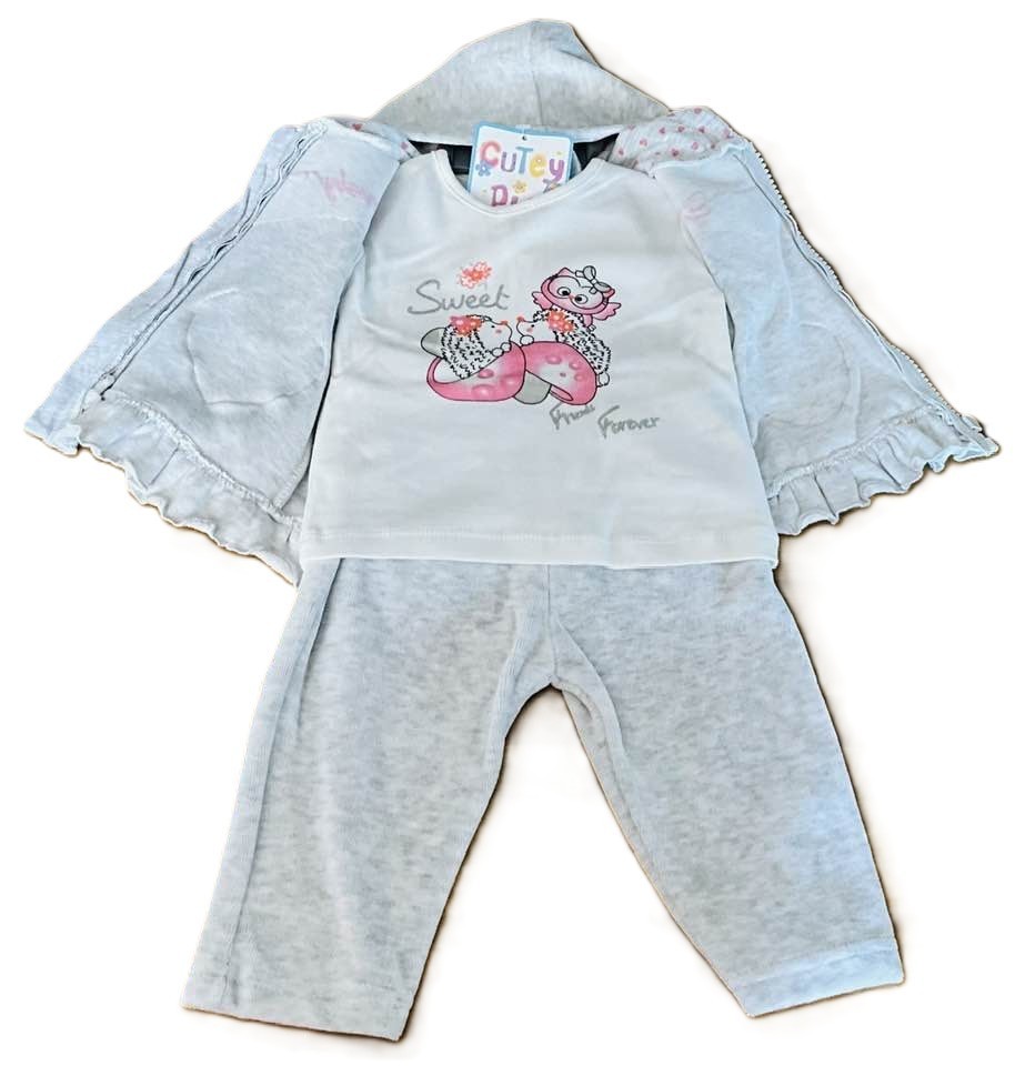 ensemble 3 pièces veste et pantalon velours gris haut mche longue hérissons 3/6m