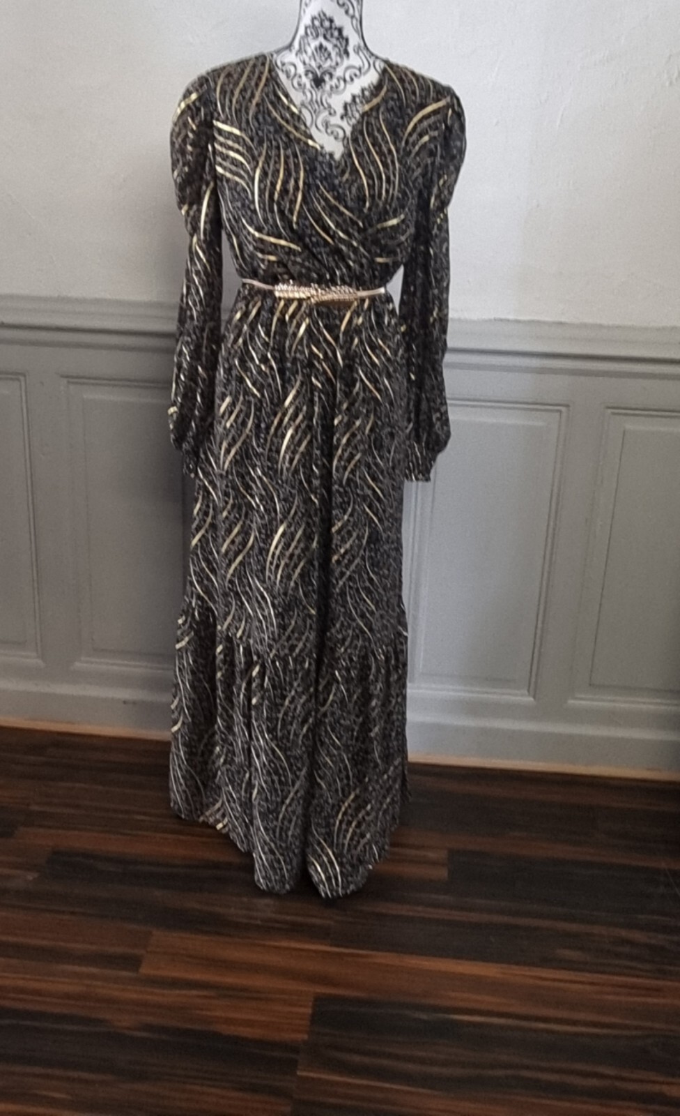 robe longue d'été ou cérémonie fluide noir fleuri et or Taille 40/42 Manche Long