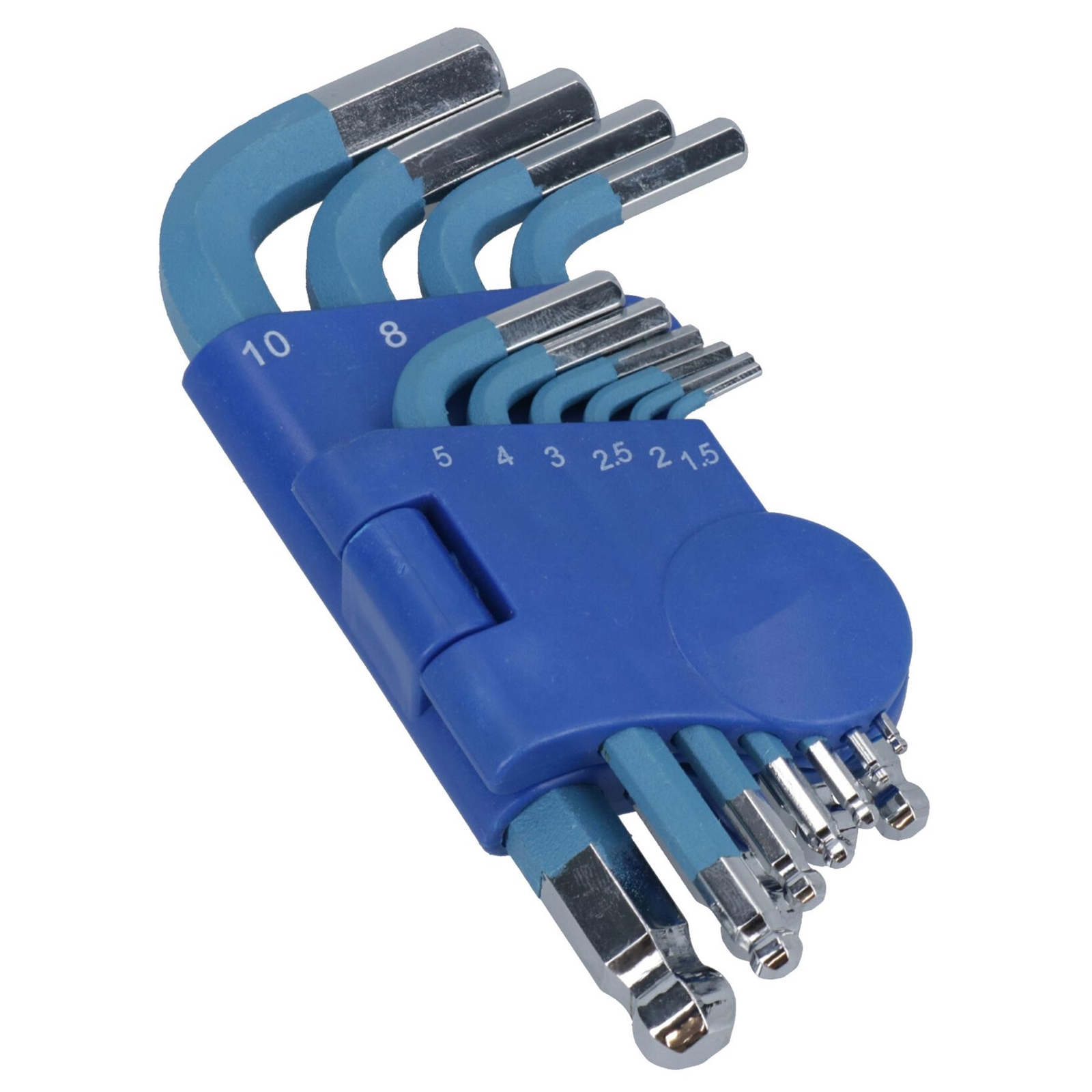 Jeu de clés hexagonales à extrémité sphérique métrique courte colorée 10 pièces. Touches allen / hexagonales à extrémité sphérique allant de 1,5 mm à 10 mm. Touches hexagonales métriques courtes pour un accès dans les zones difficiles / restreintes.
