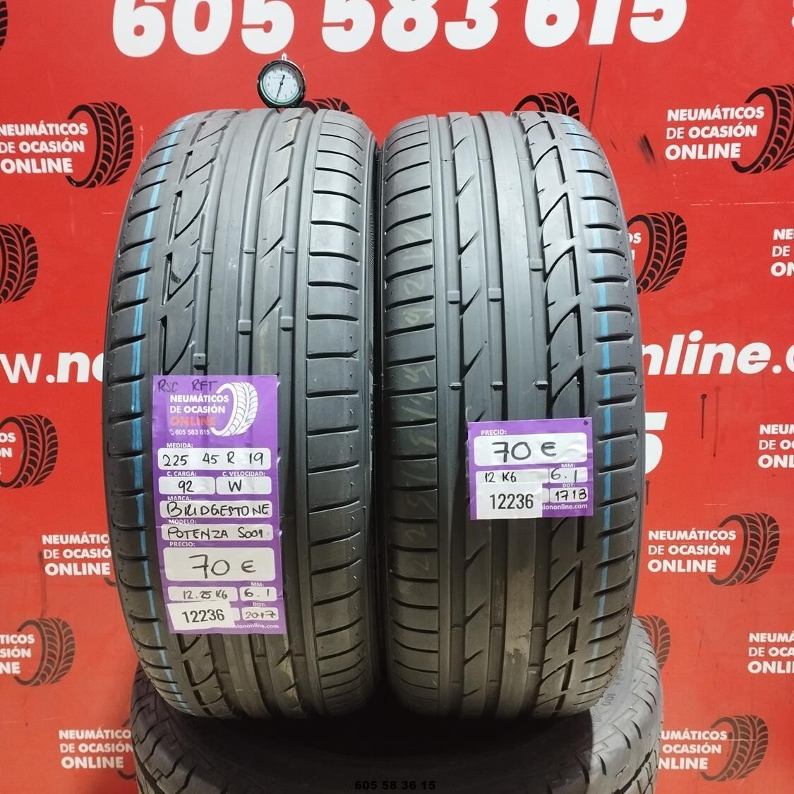 2x 225 45 R19 92W BRIDGESTONE POTENZA S001 RSC RFT 6.1/6.1mm REF:12236 VENTE UNIQUEMENT PAR PAIRE (le prix annoncé est pour la paire totale, le prix autocollant pour l'unité). Veuillez noter qu'il s'agit de produits d'occasion, alors assurez-vous que vous êtes satisfait de l'état du produit et du DOT. Assurez-vous également que le produit acheté est de la taille, du code de charge et de vitesse dont vous avez besoin. Vous pouvez le vérifier dans la fiche technique de votre véhicule. Montage et équilibrage gratuits UNIQUEMENT dans nos ateliers de Séville. Regardez bien, dans chaque publicité, les millimètres et le DOT de chacun des pneus. Nous ne livrons pas aux îles Canaries, Ceuta, Melilla ou les îles Baléares, ni vers d'autres îles européennes. *DOT fait référence à la semaine et à.