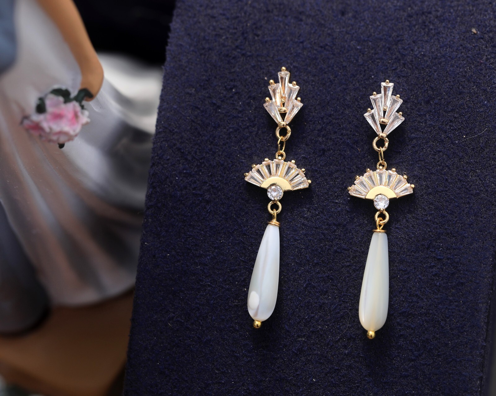 Boucles d'oreille Clous Doré Eventaille Serti CZ Baguette Blanc Goutte Nacre DZ3