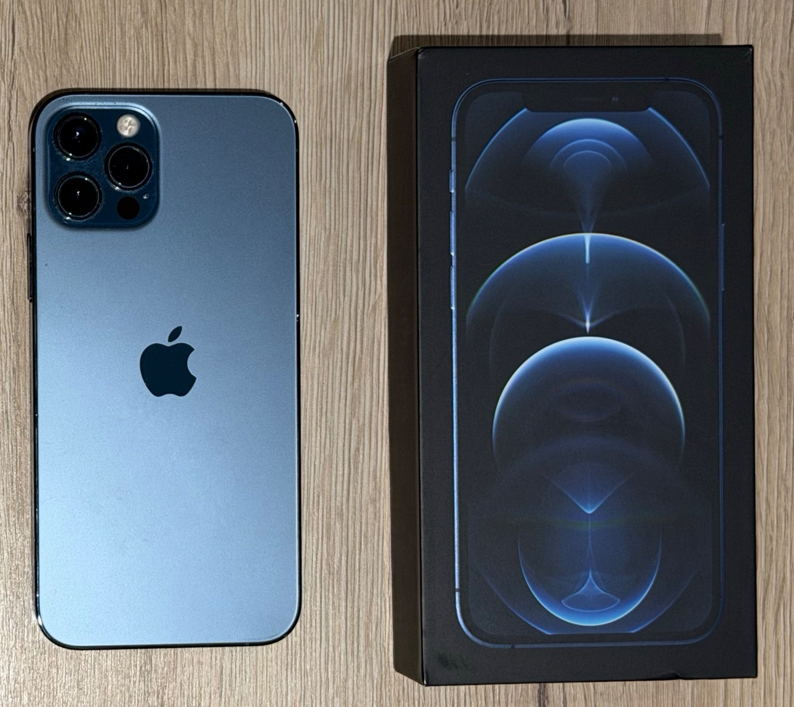 IPhone 12 Pro 256go bleu pacifique dans sa boîte, avec écouteurs et câble lightning.