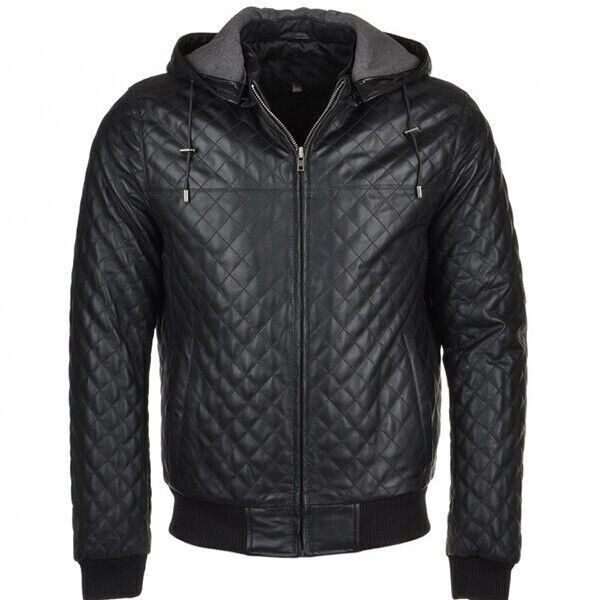 Blouson bomber noir en cuir véritable pour hommes matelassé à capuche Winer...