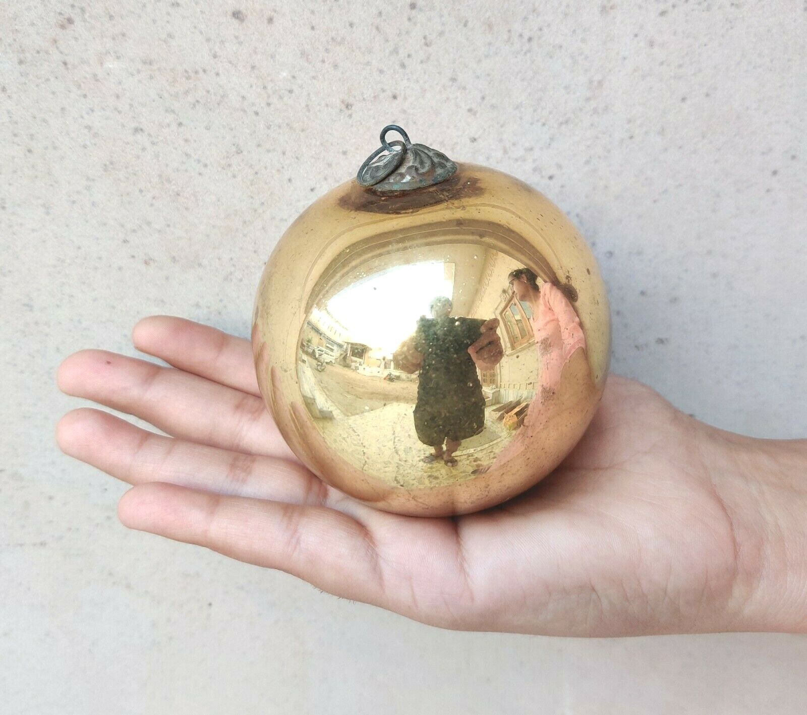DESCRIPTION Antique allemand Kugel doré 3,25" ornement de Noël ancien décoratif original 148 Taille- 3,25 pouces Circonférence : 10,25 pouces Poids- 81 grammes Fabriqué en Allemagne. Il a une jolie casquette. Perte d'argenture visible. 100% authentique ancien. Vous allez l'adorer. Usure visible. En effet un choix de collectionneur. Excellent pour la collection. Voir les photos pour plus de détails et l'état réel car les photos font également partie de la description. Veuillez noter que la couleur des articles peut varier légèrement en raison de l'éclairage lors de la prise de photo ou de l'affichage du moniteur.
