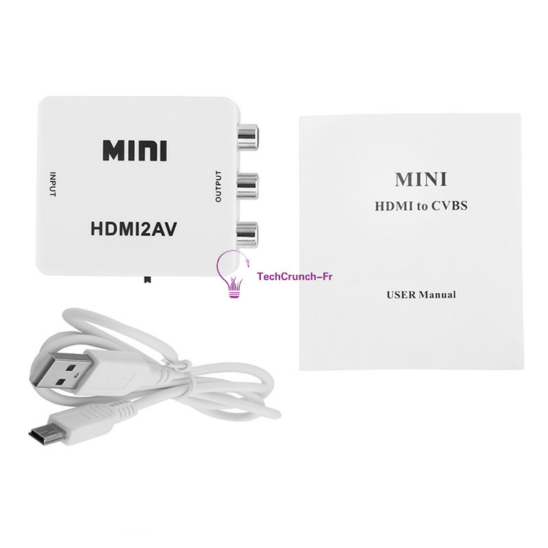 MINI HDMI to AV signal converter which will convert HDM video signal or audio signal to AV (CVBS) composite video signal and the FL / FR stereo audio signals, while support DVI system sideline signals.