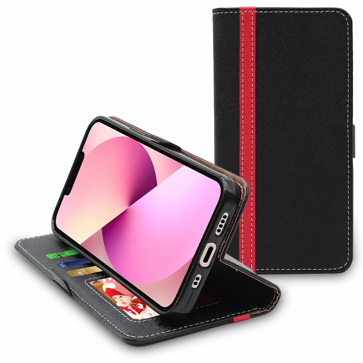 Coque Apple iPhone 13 Etui Portefeuille Housse PU Cuir Porte-Cartes Noir / Rouge