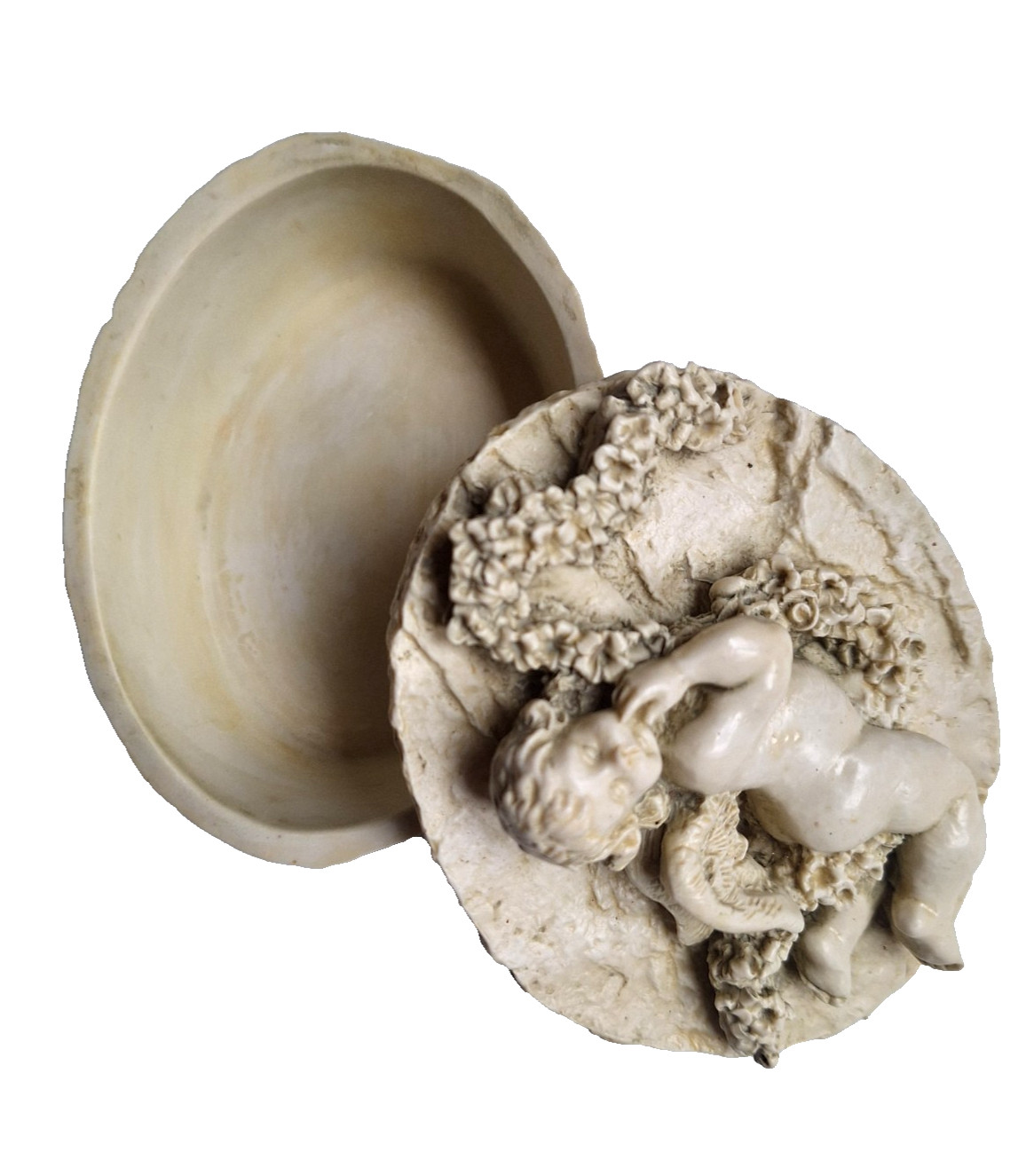 Décor ange couché. Belle boite à bijoux ancienne en résine. Expédirion prévue via Mondial Relais. Poids : 330 / Dim : 11x9cm.