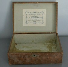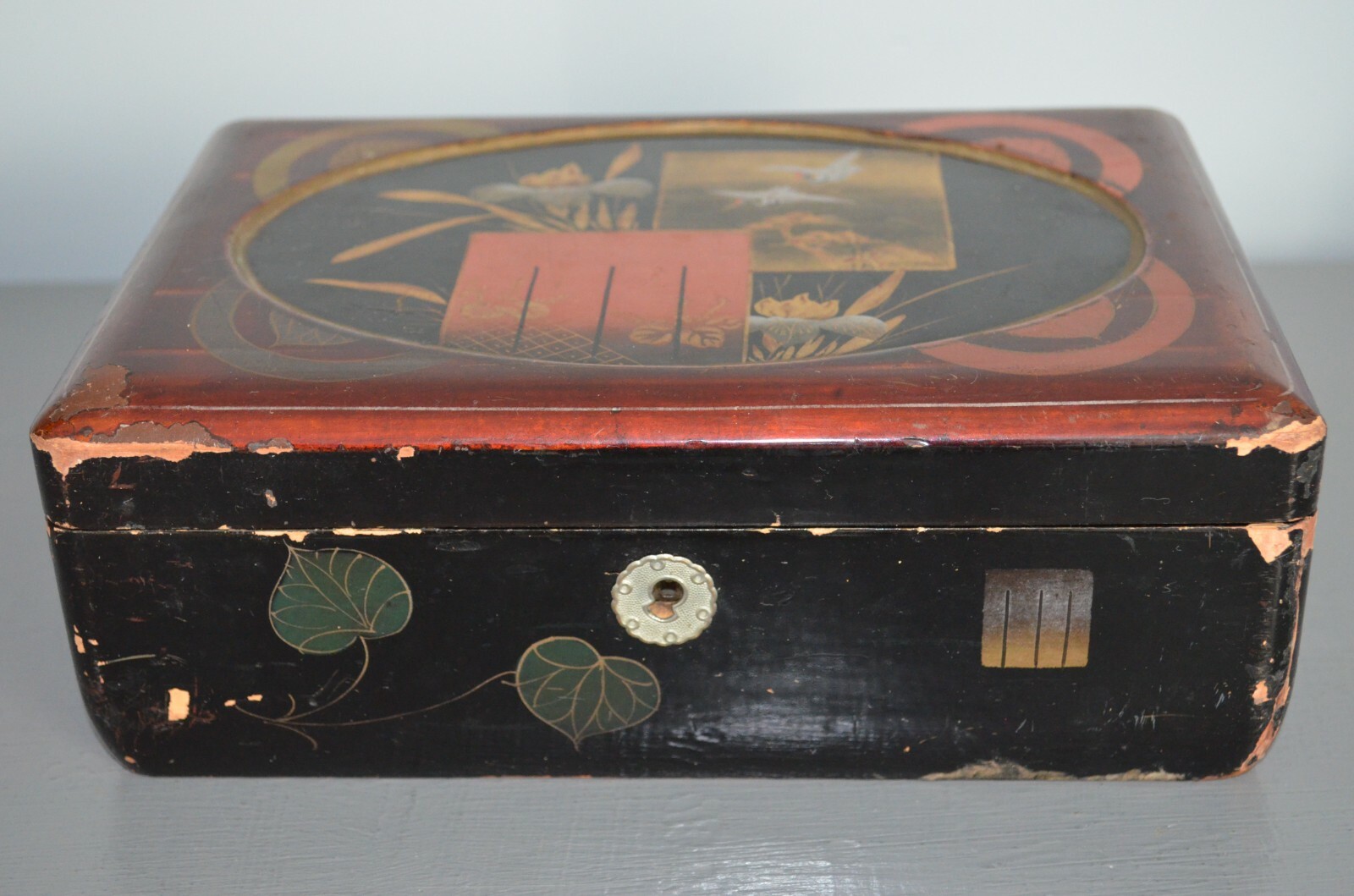 Ancienne Grande Boite Coffret Bois Laqué Décor Grue et Fleur à Restaurer