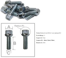 LOT DE 10 BOULONS DE ROUE M12x1,5 CONIQUE 60°. LONGUEUR (B) : 50MM. DIAMÈTRE (C) : M12. LES CARACTÉRISTIQUES SONT LES SUIVANTES .