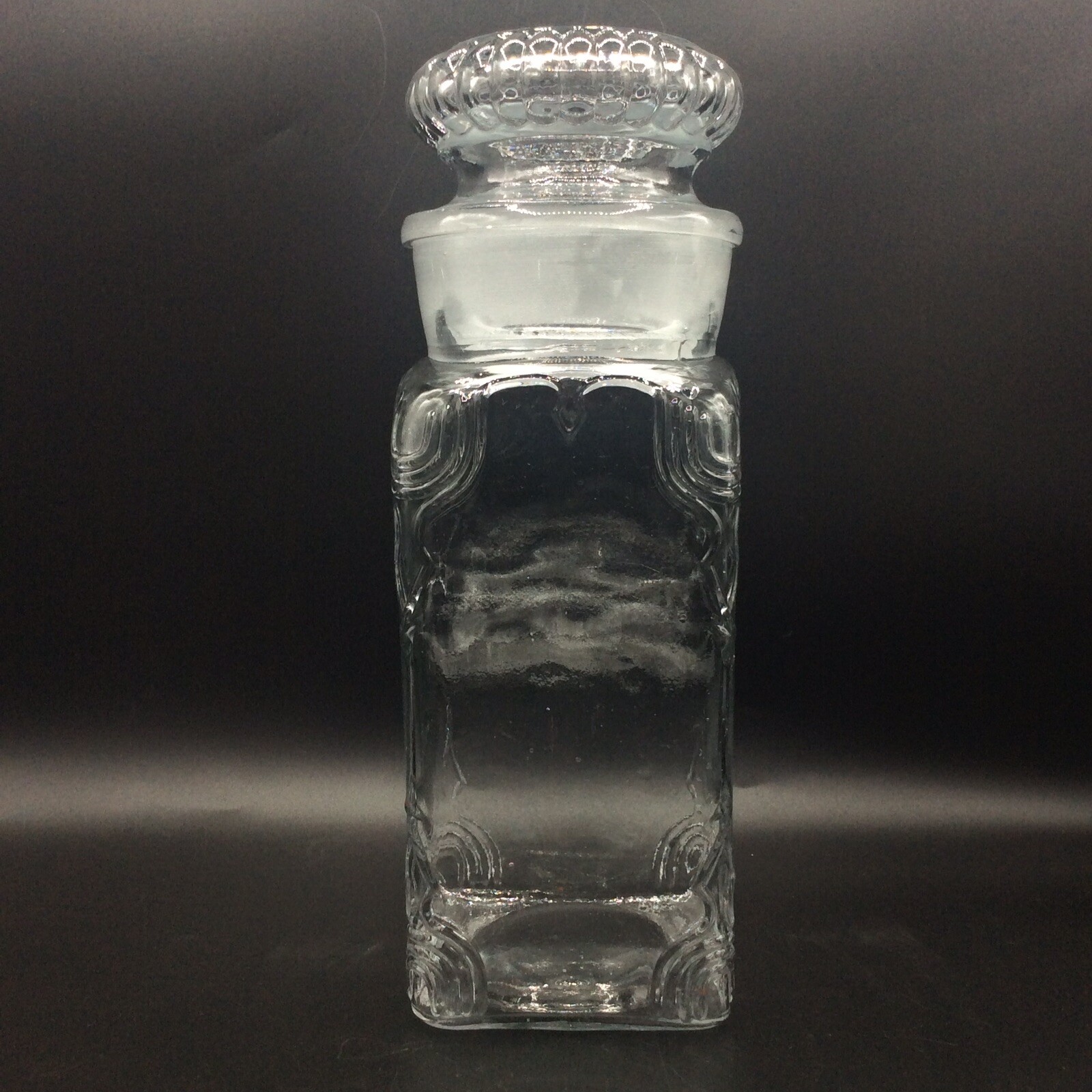 Pot bocal à bonbons en verre soufflé moulé Confiserie début XXème. Dimensions : 27,8 cm. x 9,5 cm. x 9,5 cm. ; poids : 1,241 kg. Parfait état général, légères égrenures au niveau de la base du couvercle et infimes rayures d’usage (cf. photographies).