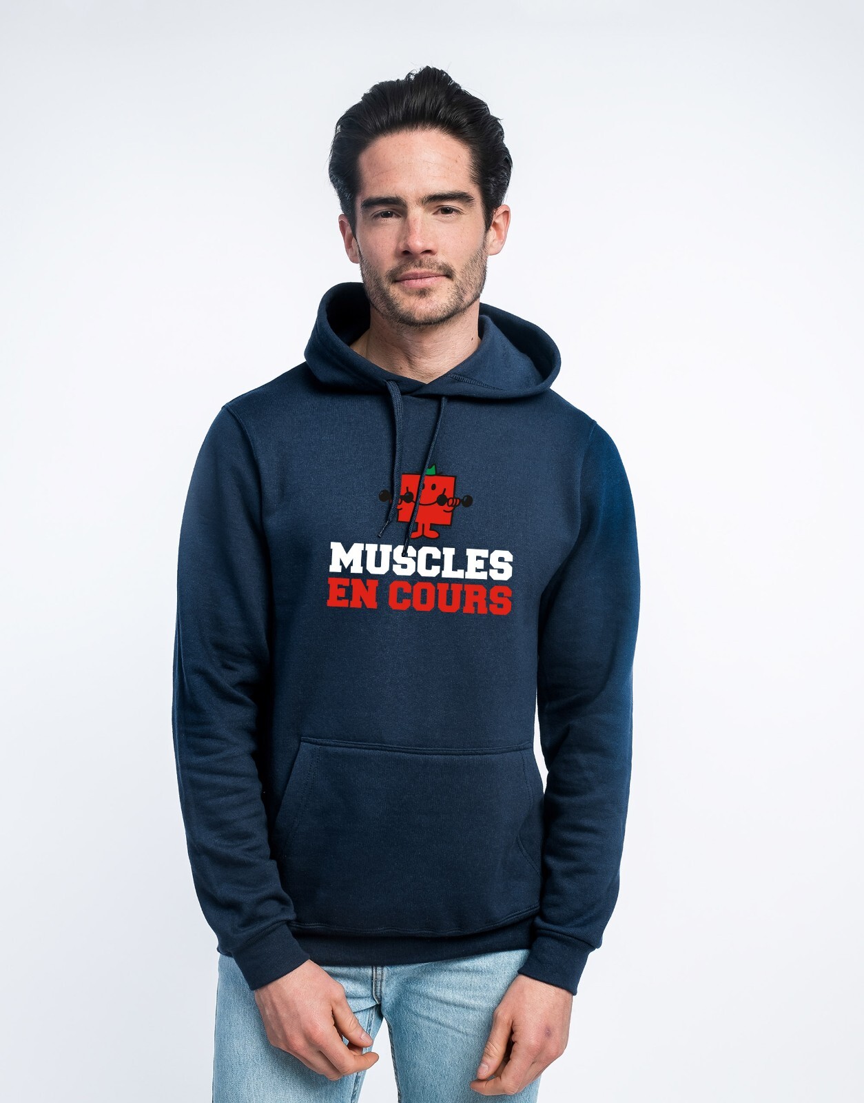 Sweat à capuche homme - MUSCLES EN COURS. Hoodie couleur bleu marine