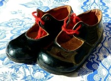 Paire de chaussures de poupée ancienne dans le style de Bru ?. marqué « 6 » en cuir foncé à boucle métal ovale ,( ressemblant à un modèle de chaussure Bru avec des boucles presque identiques ), ( voir les 24 photos ).