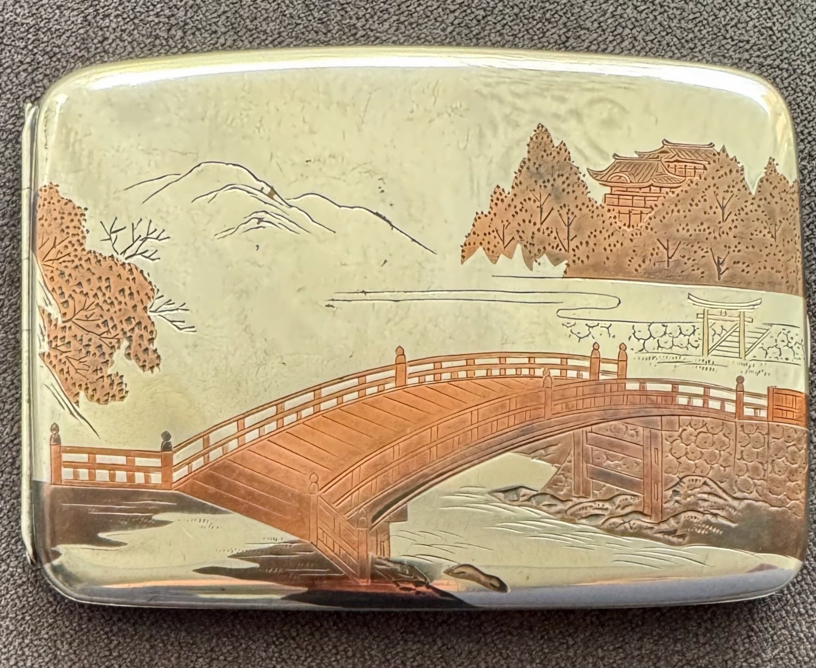 Ancien Étui à Cigarettes Japonais en Argent Massif 950 Pont Temple