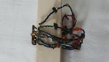 Les tons bleus apaisants de déclinent en plusieurs nuances, rehaussés par des détails dorés. L'association des perles en résine bleues et des cordons tressés créé un effet multi rangs tendance.