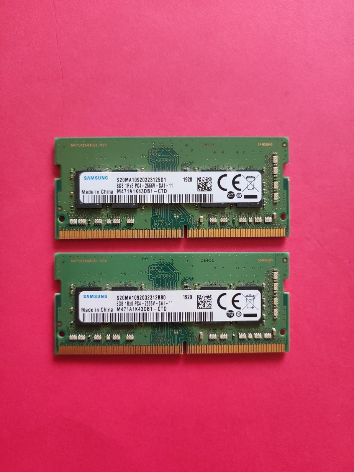 Lot de 2 barrettes mémoires sodimm 8GB 1Rx8 PC4 2666V Samsung. Testée OK en fonctionnement et par logiciel. Merci de vérifier la compatibilité avec votre pc, pas de retour.