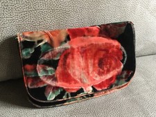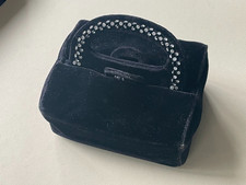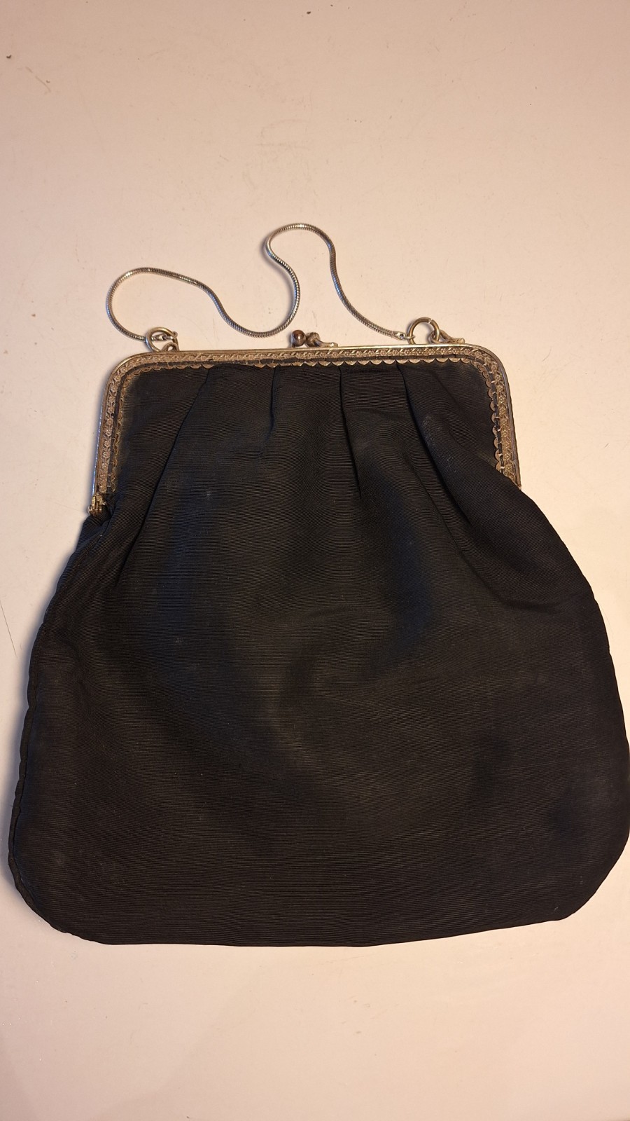 Élégant sac de soirée ancien en tissu noir (type satin/soie), avec monture métallique décorée et fermoir à boule (kiss-lock), typique des années 30. ✨ Détails : Dimensions : environ 22 cm de large x 20 cm de haut Ouverture : 16 cm Chaîne fine d’origine (porté main ou épaule courte) Joli cadre en métal travaillé avec motifs décoratifs Intérieur en tissu 🕰️ Époque : années 1920–1940 (style Art déco) 📌 État : Bon état général pour son âge. À noter : traces d’usure sur le tissu et à l’intérieur (voir photos). Fermoir fonctionnel.