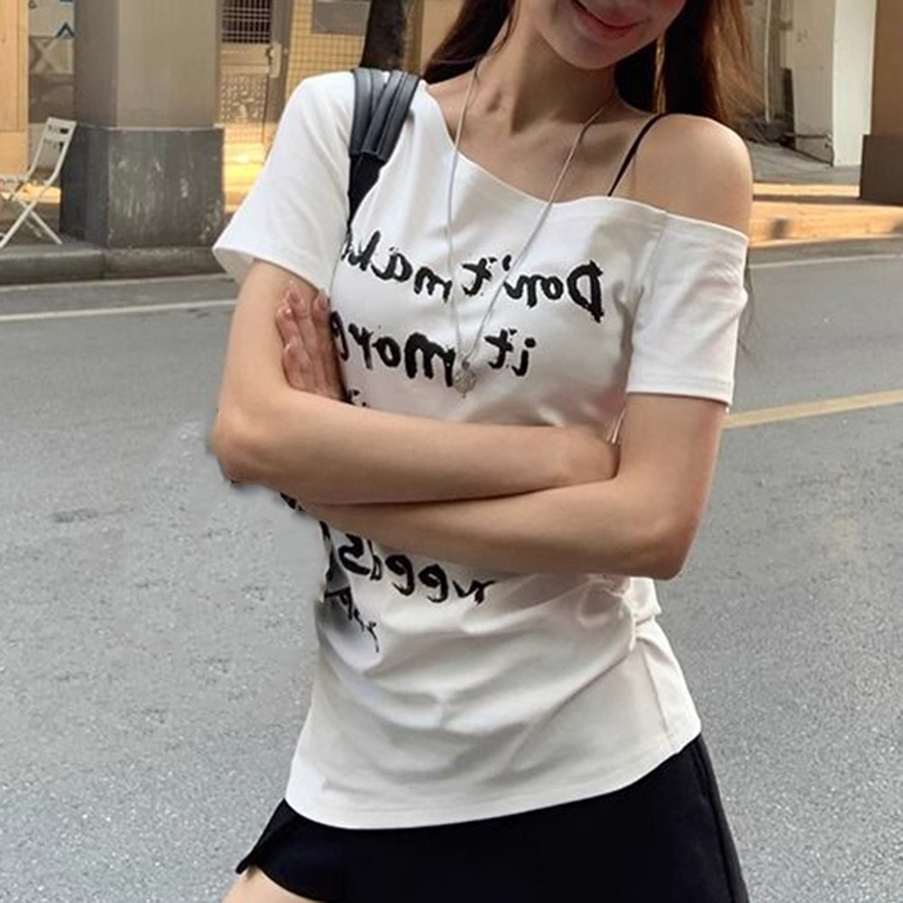 (9) Application:Daily. 8) Saison appropriée : toutes saisons. 7) Style:Casual. 6) Pattern:Letter Printing. 5) Élasticité : microélasticité. 4) Sleeve Style :Short Sleeve. 3) Neckline :Off-shoulder.