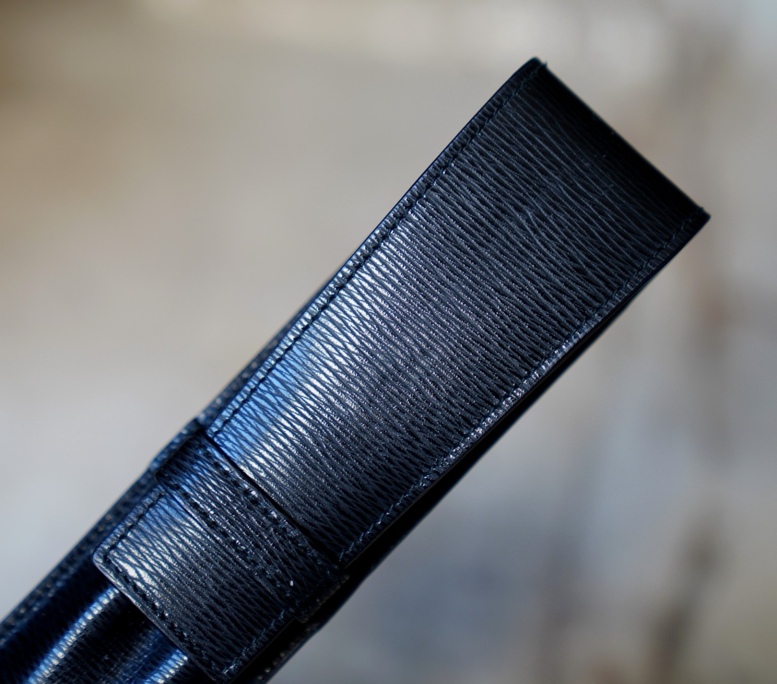S.T. DUPONT. Etui à stylos en cuir noir, à rabat avec anneau en métal. Modèle deux places avec séparation intérieure.