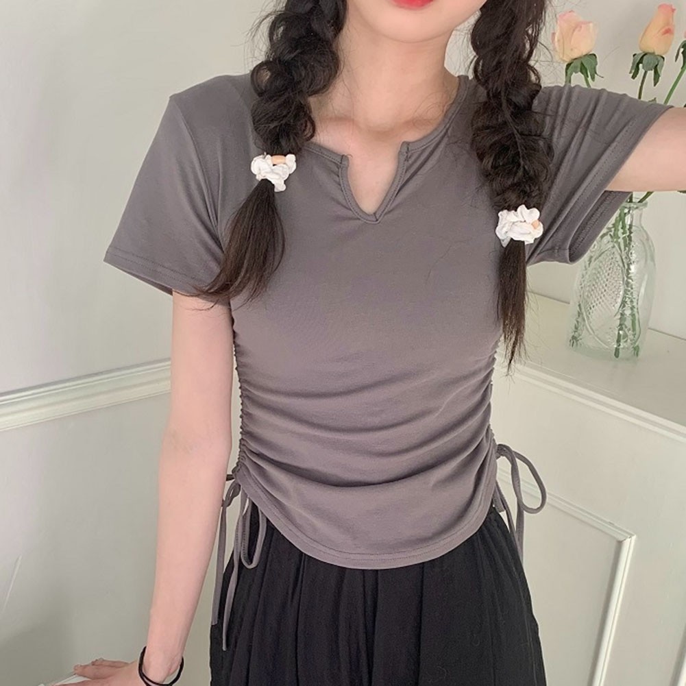 T-shirt femme été col V à lacets avec manches courtes pour un style facile