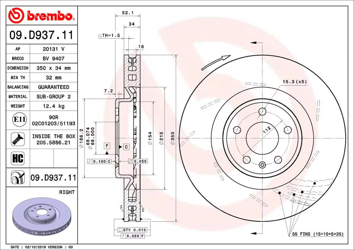 Disque de frein (à l'unité) BREMBO 09.D937.11 PORSCHE MACAN 3.0 S Diesel