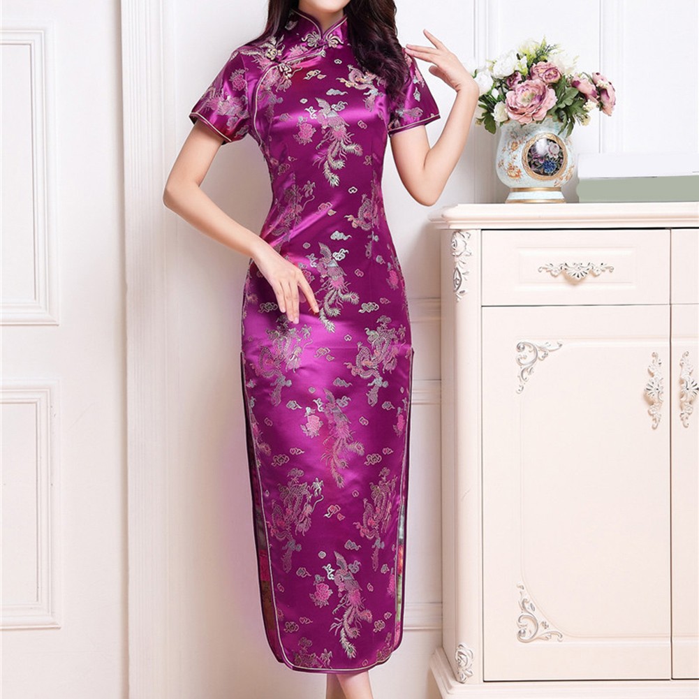 Robe longue fine traditionnelle chinoise Cheongsam pour femme style col fendu la