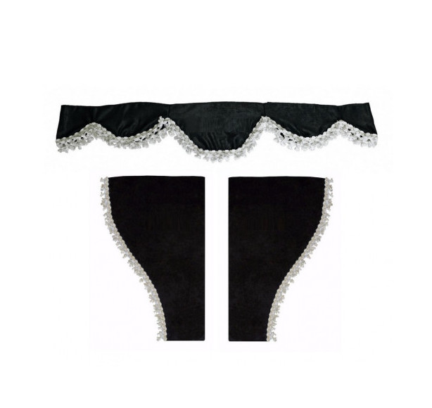 Lot de 3 rideaux décoratifs en velours peluche avec pompons blancs Convient pour camion Scania R S G P. 2 rideaux latéraux d'environ 50 x 70 cm pour les 2 fenêtres latérales (gauche et droite). Fabriqué en velours peluche de haute qualité et pompons blancs.