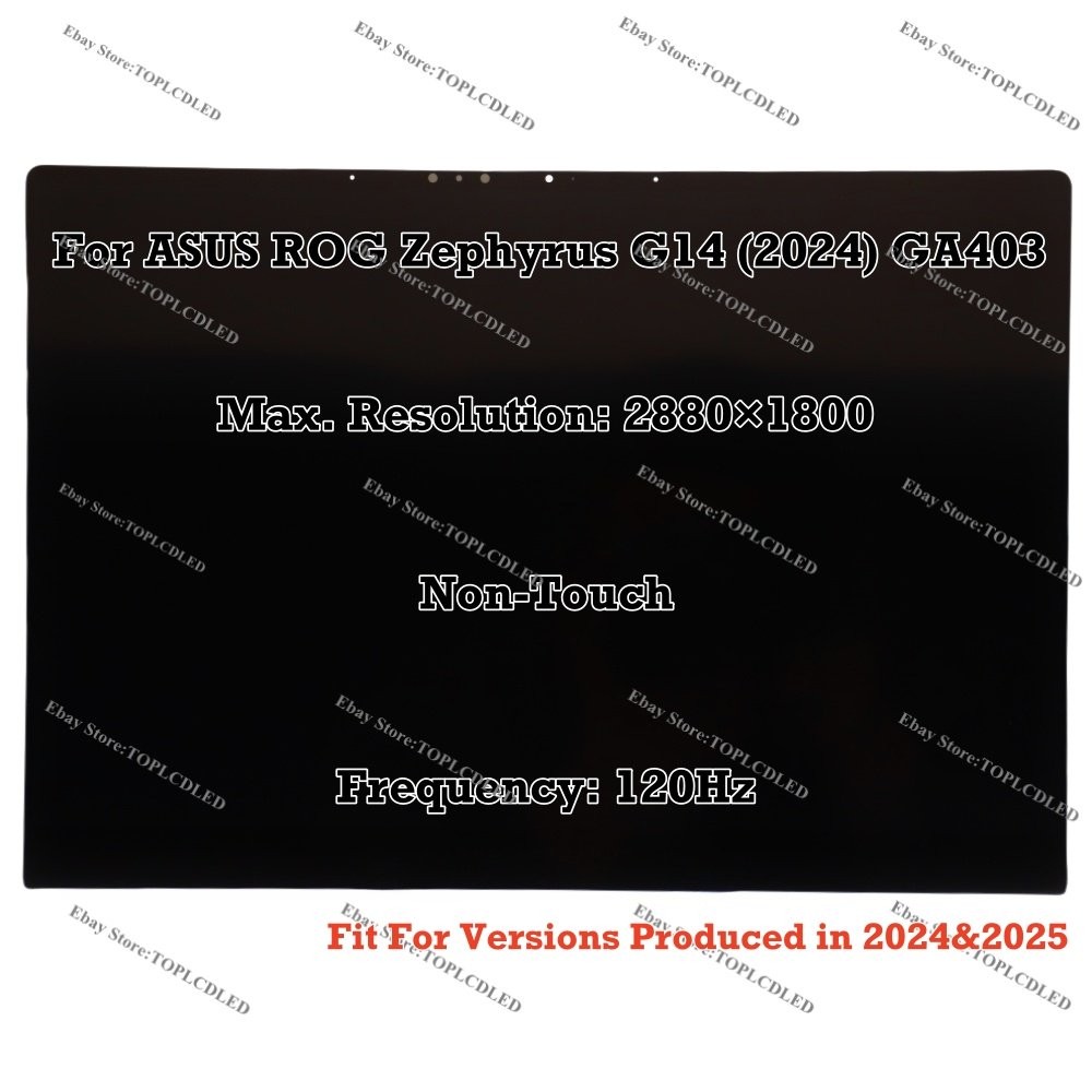 14.0" For ASUS ROG Zephyrus G14 (2024) GA403 OLED 2.8K 2880×1800 120Hz LCD Display Complete Assembly Non-Touch Replacement Panel VERY IMPORTANT! PLEASE READ BEFORE YOU BUY!!! • Only works on Max.Resolution 2880×1800 OLED! If you have an FHD or LED version please do not purchase this item • Item Condition: Brand New • Size: 14" • Compatible Model: For ASUS ROG Zephyrus G14 (2024) GA403 • Resolution: 2880×1800 OLED .