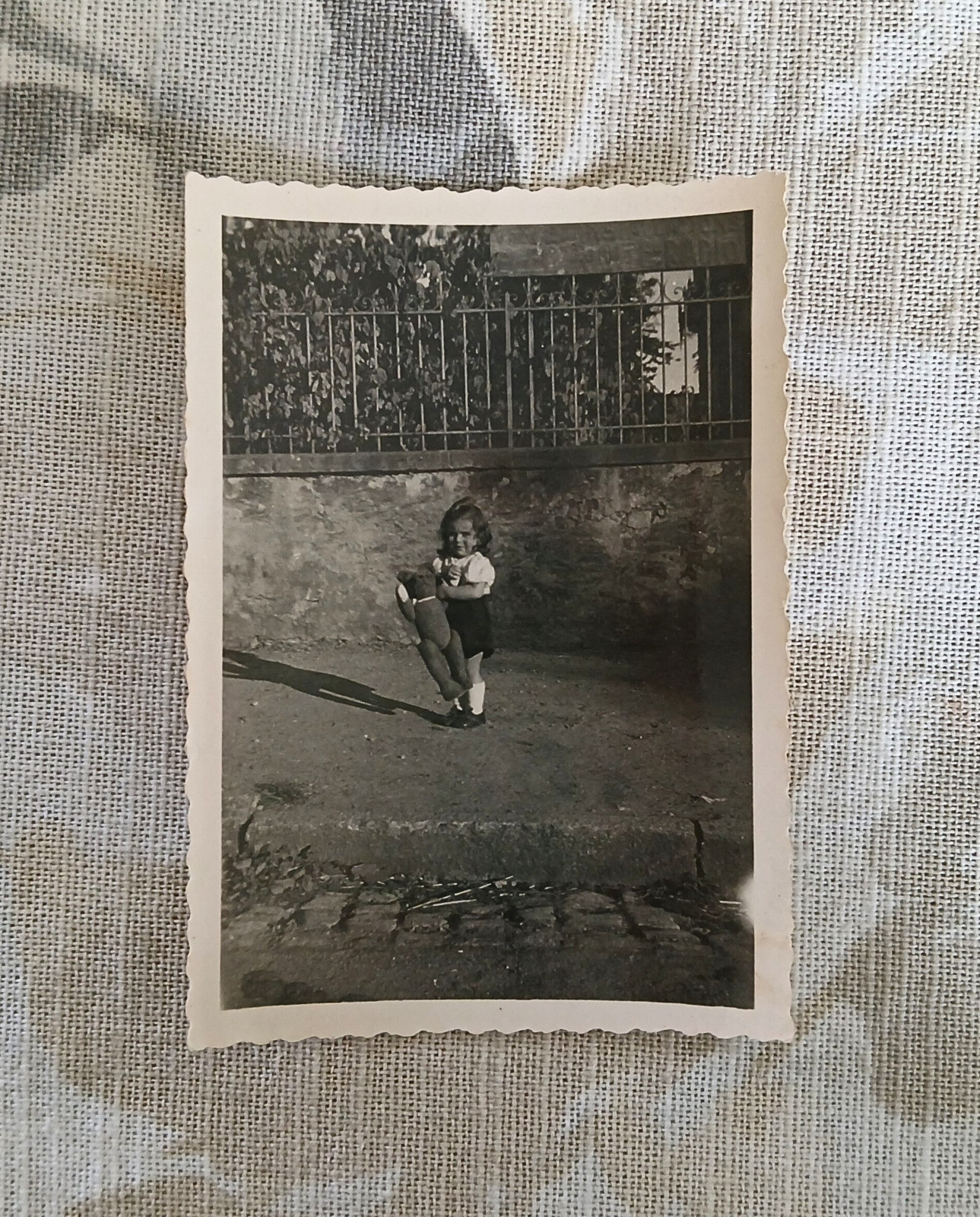 Photo Ancienne Snapshot Vintage Petite Fille avec son Ours en Peluche 6.4 x 8.9