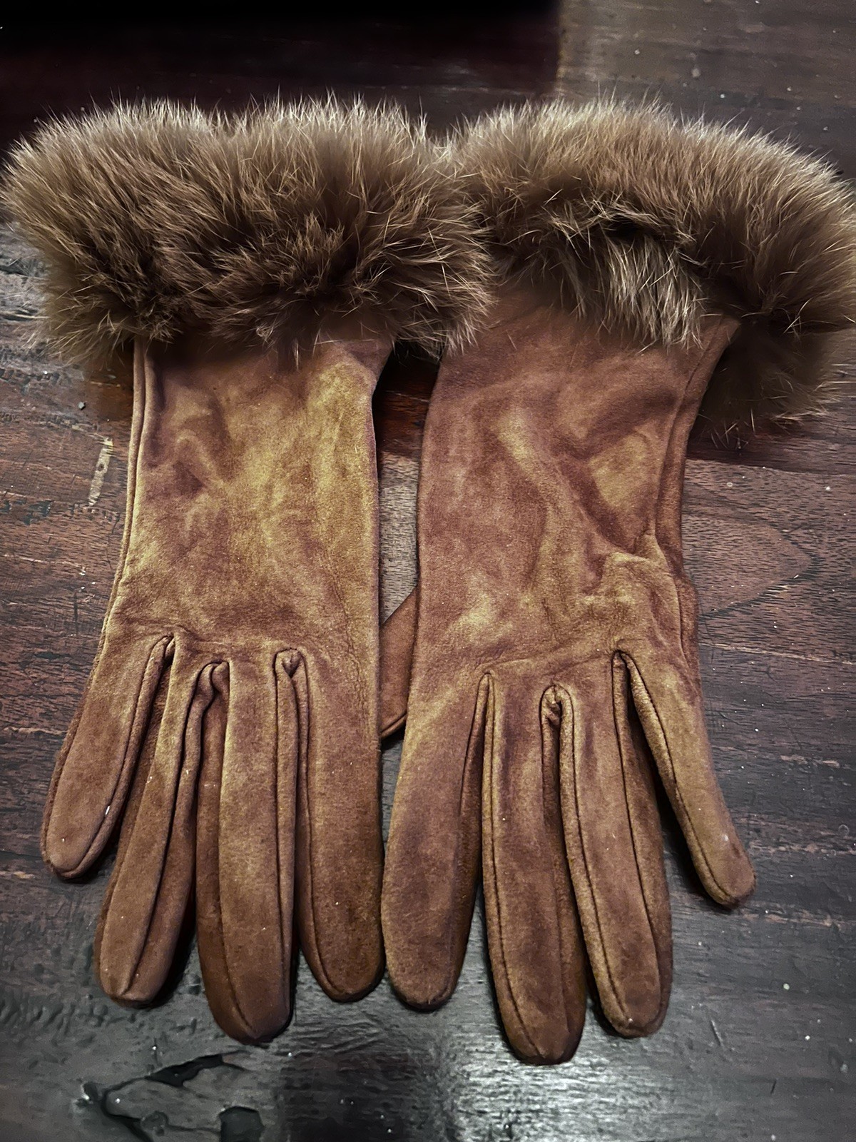 Superbe paire de gants vintage (ou style vintage) de très haute qualité, fabriqués à la main en Italie. Un accessoire raffiné, parfait pour compléter un look hivernal chic ou pour un cadeau classe. • Finitions : Elégante bordure en fourrure véritable, volumineuse et douce, aux poignets. • Doublure intérieure : Intérieur fin en 100% Soie (Soie), qui garantit un confort et une chaleur extrêmes sans rayer la peau. Les gants sont en excellent état cosmétique. Le cuir a la texture naturelle du daim et la fourrure est épaisse et bien conservée. (Remarque : vérifiez les petits signes d'usure et ajoutez-les ici si nécessaire.) Ce ne sont pas les gants commerciaux habituels : la combinaison cuir-soie-fourrure est typique de la maroquinerie italienne haut de gamme. La doublure en soie est une rareté.