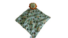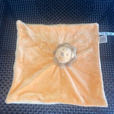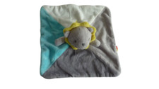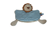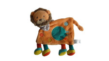 Doudou plat lion 27 cm environ, anneaux dentition, mati�re bruissante, blanc maron motif rond. Etat : Comme neuf