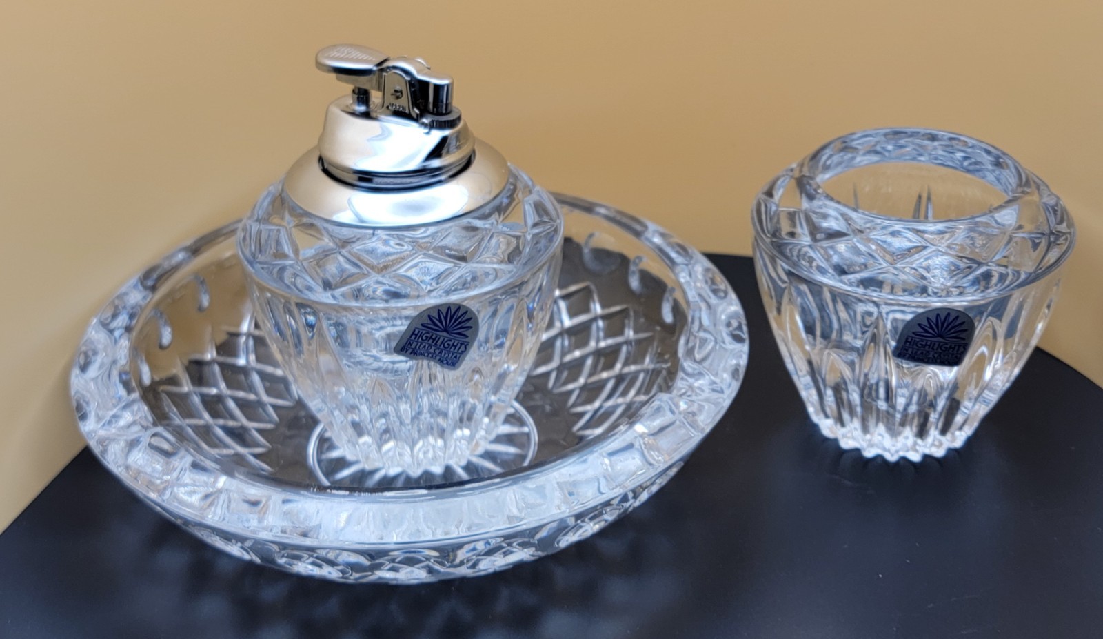 Princess House Highlights Ensemble à fumer 3 pièces en cristal de plomb taillé. Comprend un briquet de table de 4 ½" de haut, un cendrier de 7" de diamètre et un porte-cigarette de 3 ¼". Nouveau vieux stock, sans boîte Suivre les pages vues avec Le comptoir d'Auctiva.