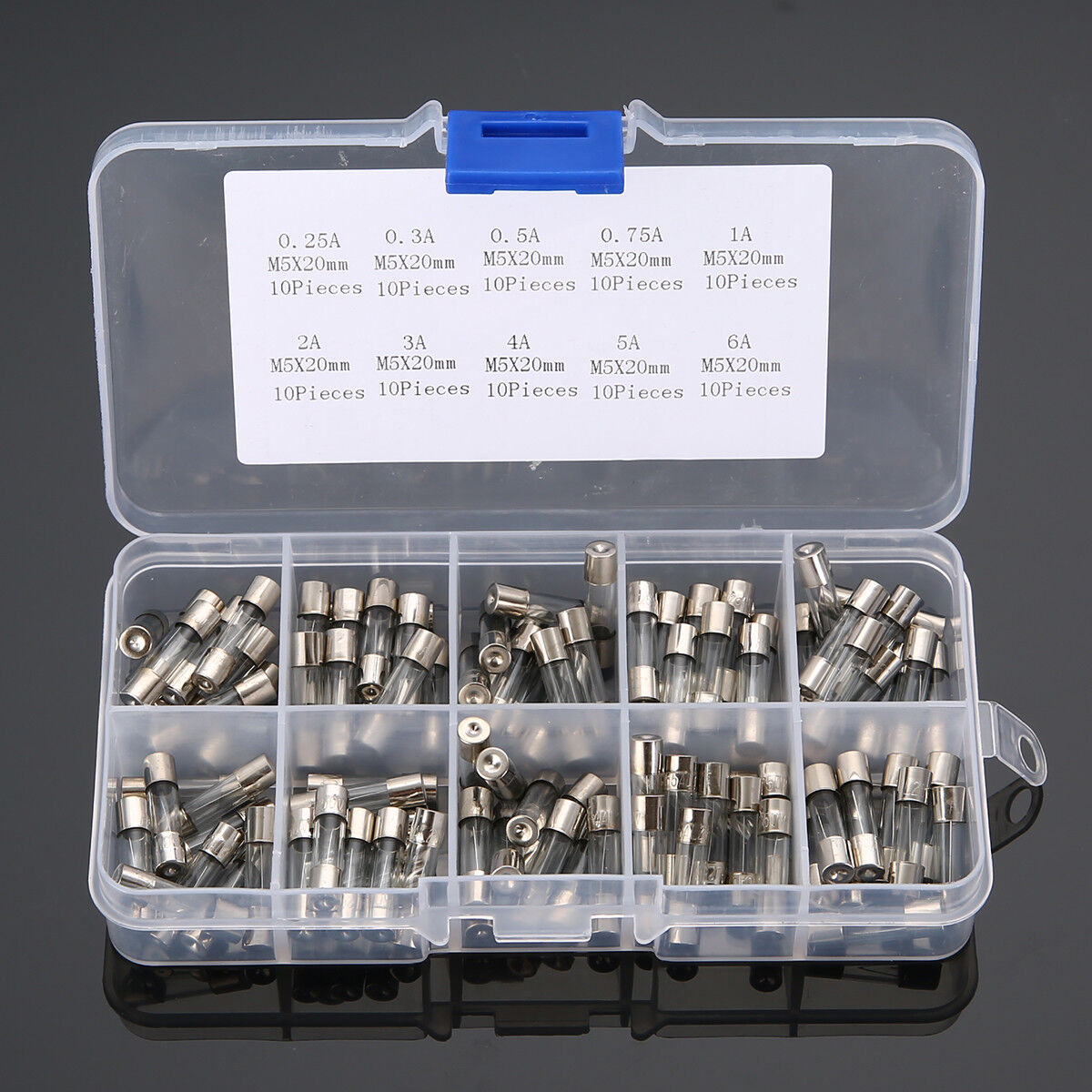 100pcs Fusible Tube en Verre Fast-Blow 5x20mm 0.25A-6A Fuse Assorted Kit MS