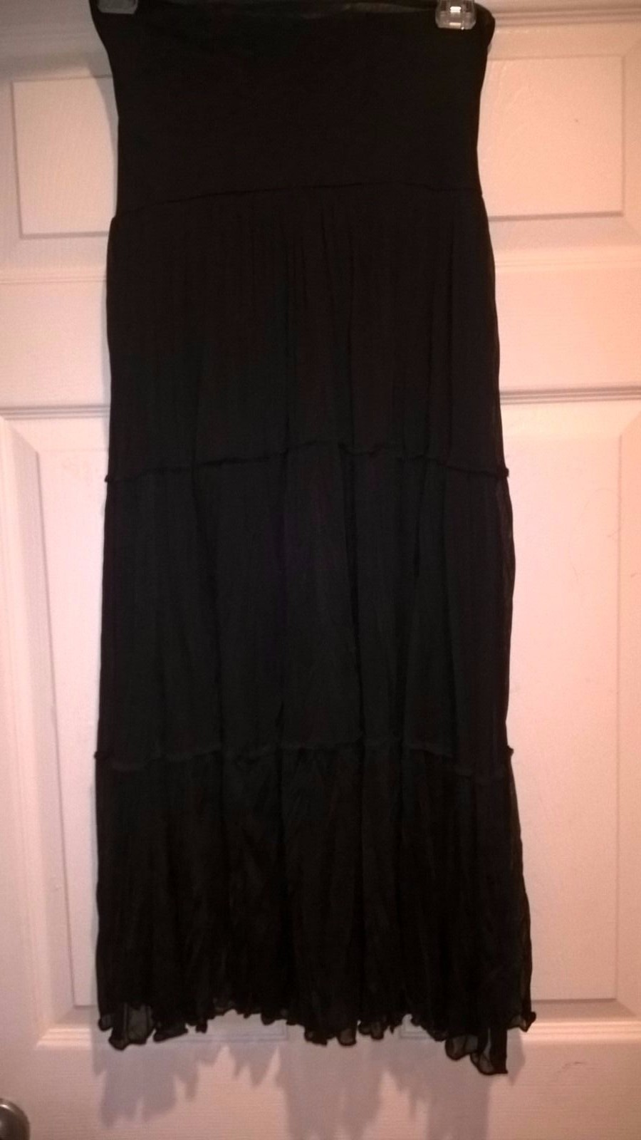 Excellent used condition. Well cared for. No stains, rips or tears. Small tag on front but might not see because of the way the skirt falls (see photo 3). Tiered long skirt look. Soft mesh top layer over a solid nontransparent bottom layer. Waist band shown in picture all the way up but meant to fold-over or bunch depending on how you like to wear (see photo 2).