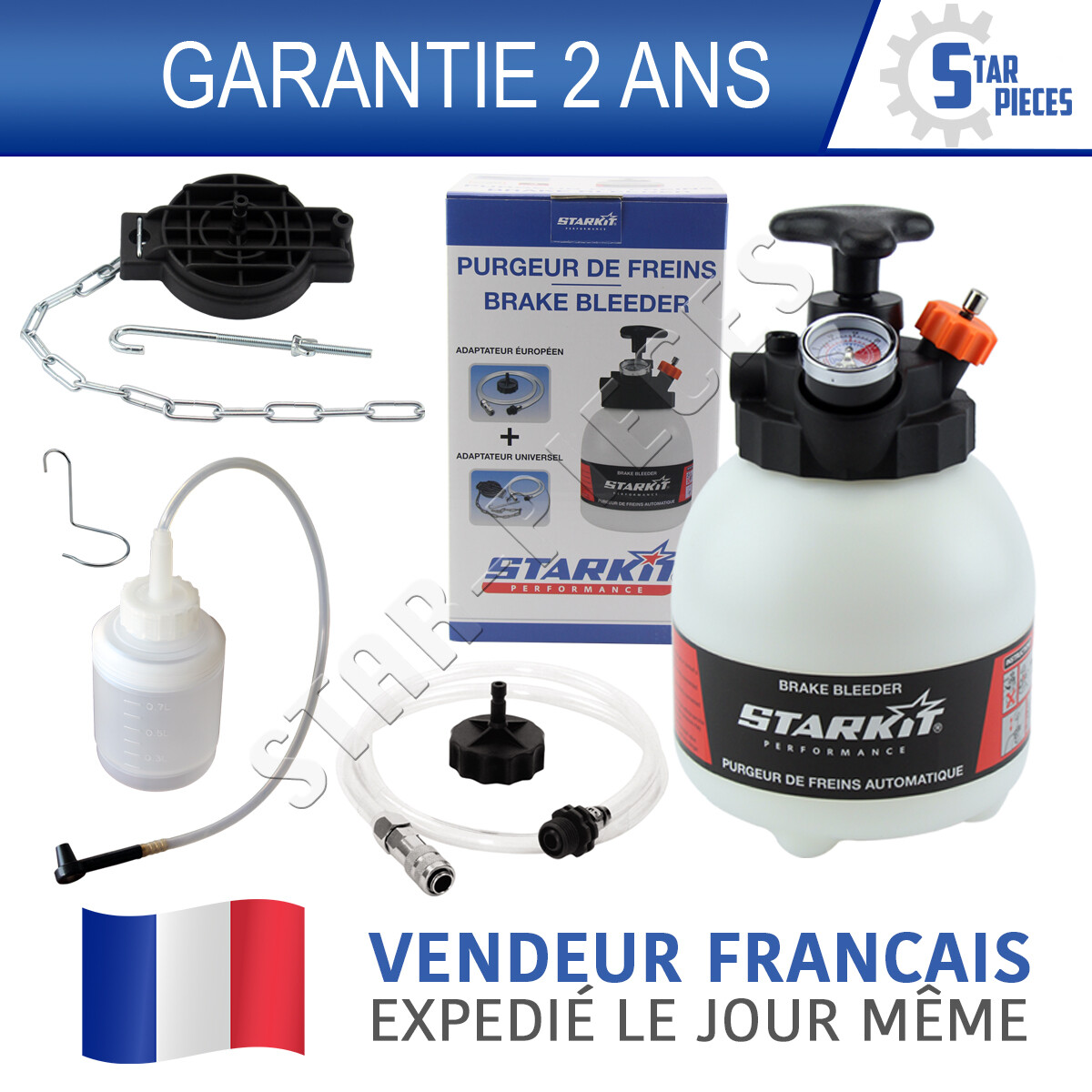 Kit complet purgeur de frein et d’embrayage. Ce purgeur de qualité professionnelle est prévu pour une utilisation intensive ou occasionnelle, utilisé par les garages. KIT COMPLET PURGEUR DE FREIN ET D'EMBRAYAGE + BOUTEILLE.