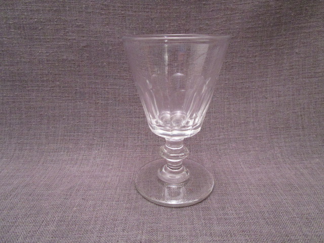 Verre de table a vin ancien en cristal,décor a 9 facettes,en bon état. diamètre du pied:6.3cm.