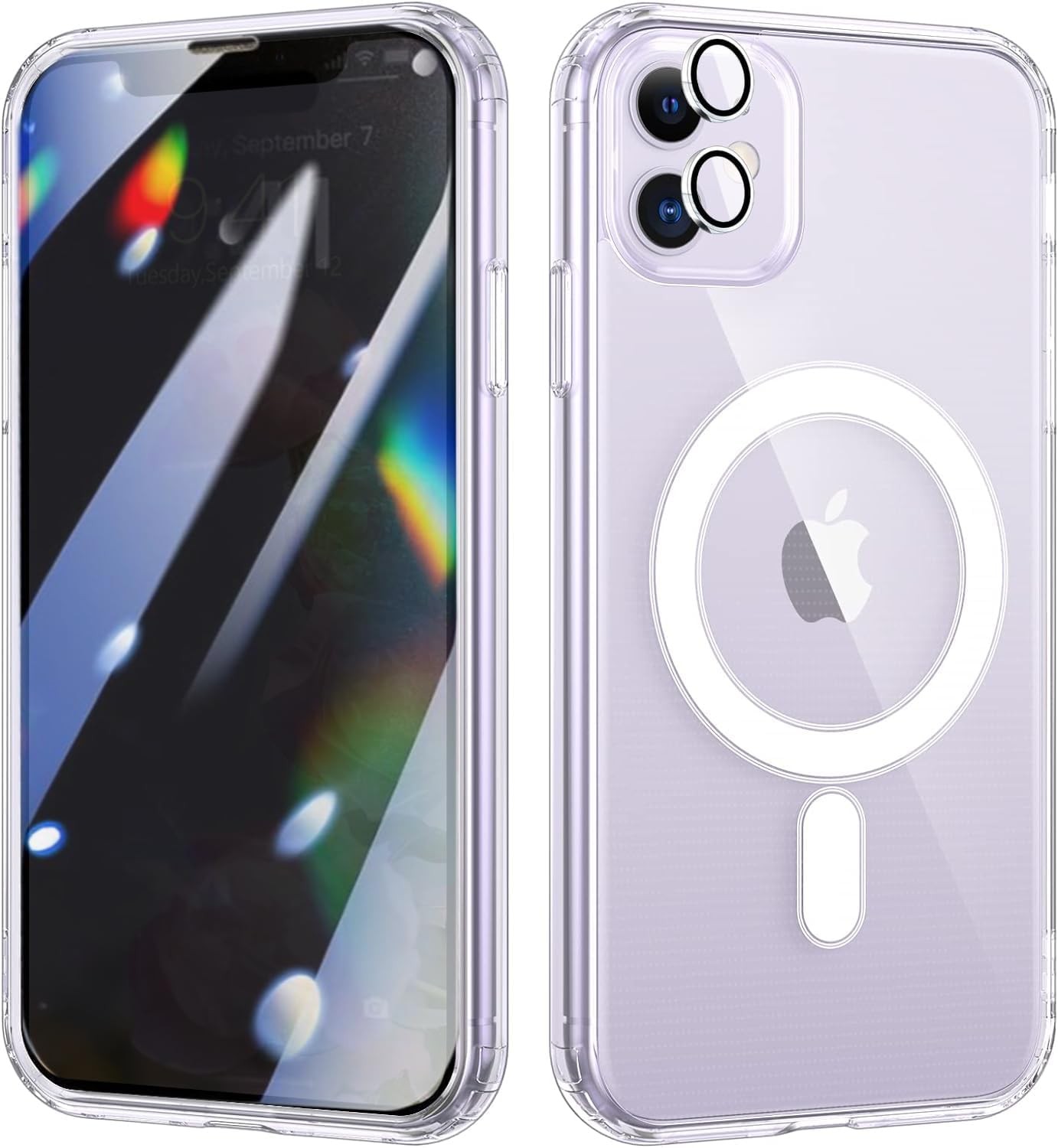 Compatible avec Apple iPhone 11 (Ecran 6,1 pouces). Coque en Silicone Rigide transparente Compatible Magsafe (charge Induction) + Protection Ecran Avant et Camera Arriere en Verre Tremp. Marque : Little Boutik