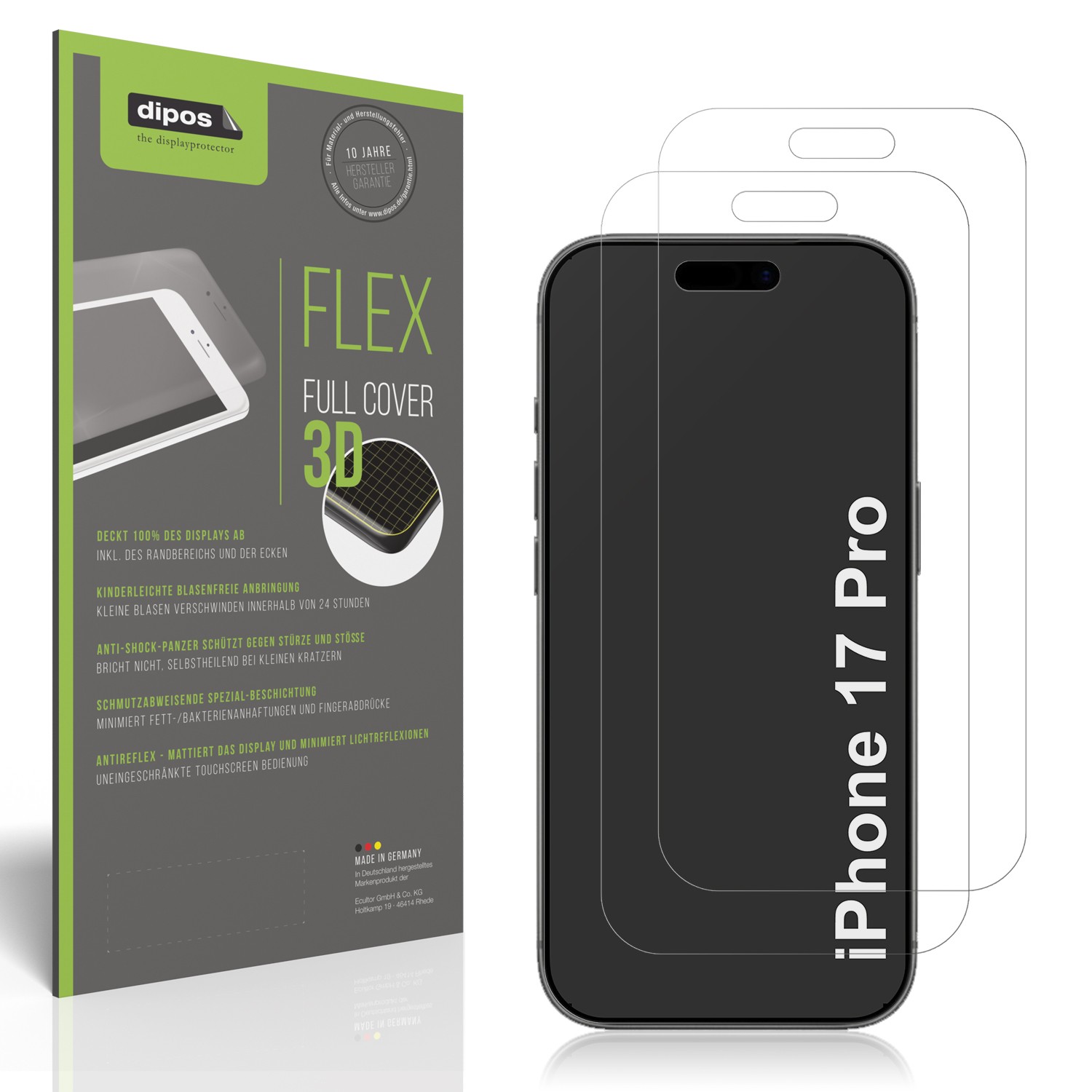 2x film de protection d'écran dipos FLEX adaptés au Apple iPhone 17 Pro. N'oublie pas que le mat réduit la netteté de l'image et la saturation des couleurs. 2x chiffon de nettoyage d'écran ZEISS pour un nettoyage doux et sans traces.
