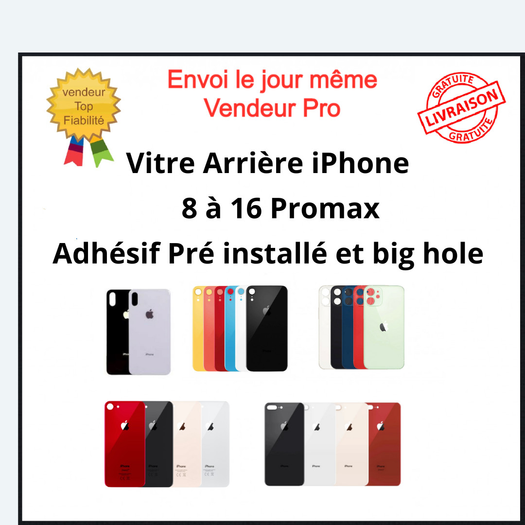 Vitre Arrière Pour iPhone. Seule la vitre arrière jaune " trou d'origine" nécessite la dépose des lentilles. Toutes les vitres sont vendues avec logo et un adhésif déja installé.