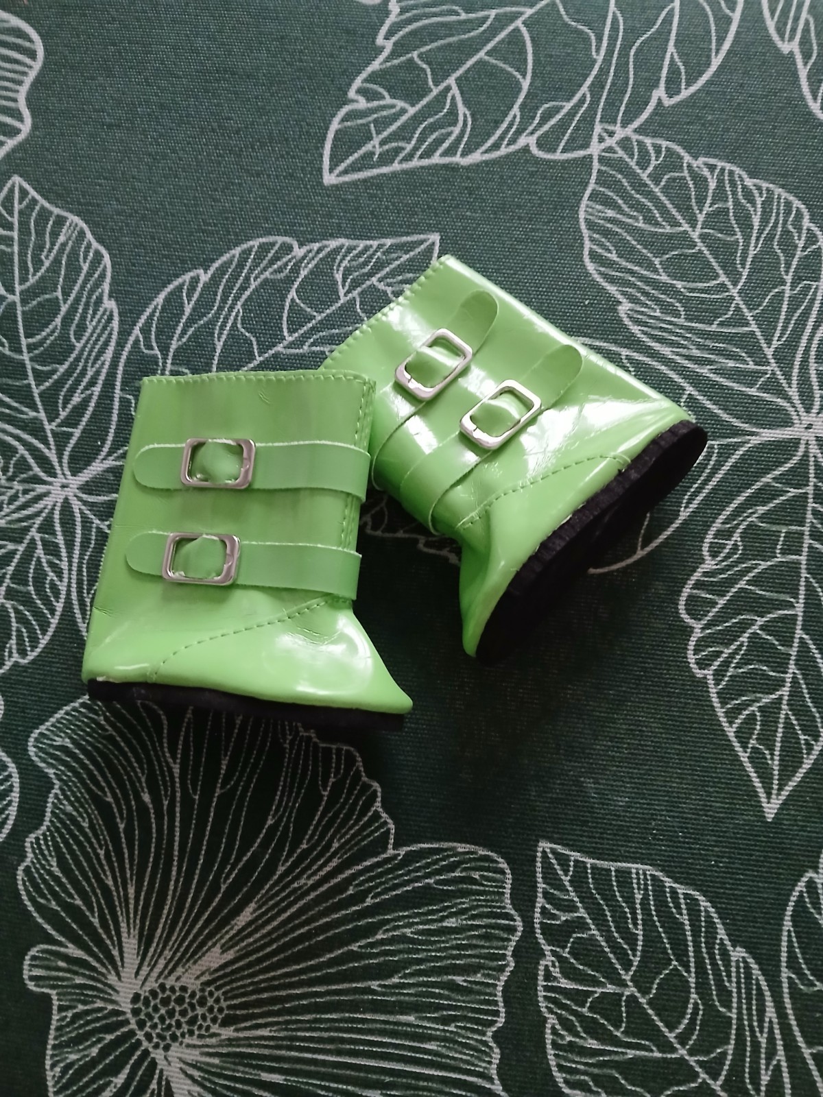Jolies petites chaussures, bottes vertes vernies pour poupée de 40 cm.