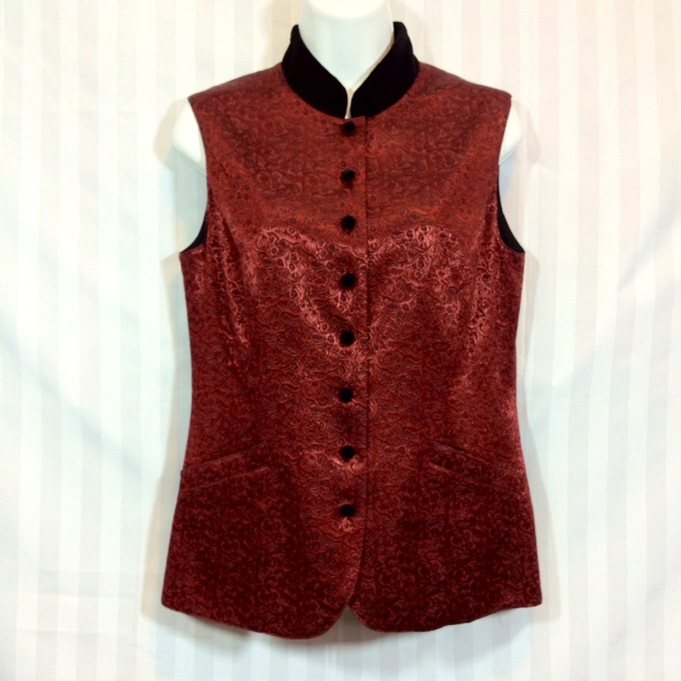 Coldwater Creek Sz 6 Medium Red Black Mandarin Vest Sleeveless Shirt Velvet Trim