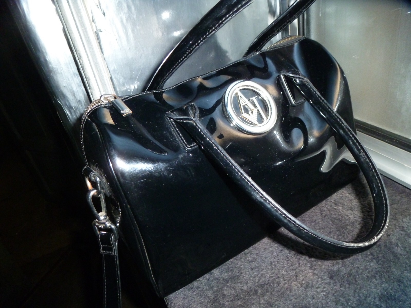 Sac Armani Jeans en vernis . Cristal noir PVC . Ce sac est très pratique pour voyager sans trop de profondeur les documents sont faciles à retirer . Il peut aussi être confortable pour le shopping comme fourre tout . Le sac est authentique , griffe intérieure , monogramme sur la tirette de la fermeture éclair . Le sac n'a aucune tache , aucune éraflure ce sont les reflets du vernis qui donnent l'impression de défauts. Logo en acier . Imperméable et très résistant . Parfait état . Très agréable à porter