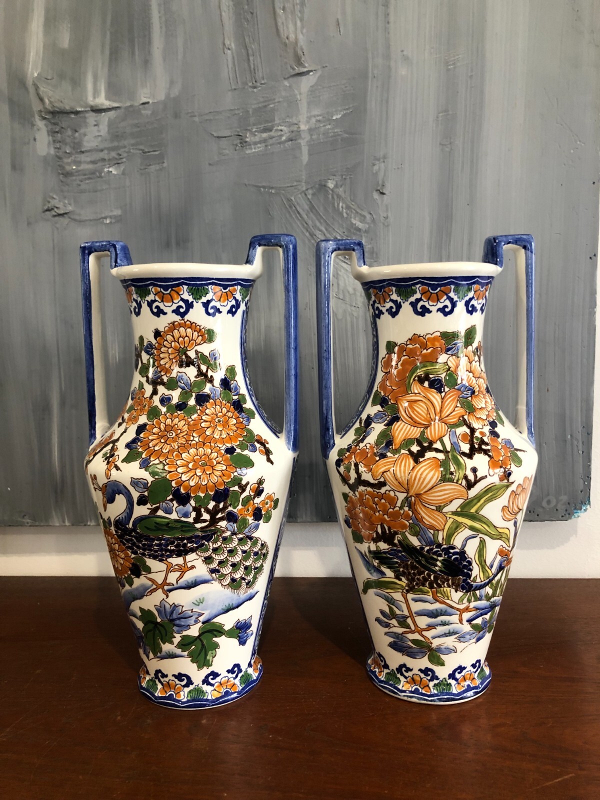 JOLIE PAIRE DE VASES BALUSTRE A 2 ANSES. Décor DELFT AU PAON. EN FAÏENCE DE GIEN. ILS SONT EN BON ÉTAT. DIAMÈTRE DE LA BASE 8,5 cm. Tous les objets proposés sont vendus dans leur état de chine, ils sont d'occasion et ont par conséquent un vécu.