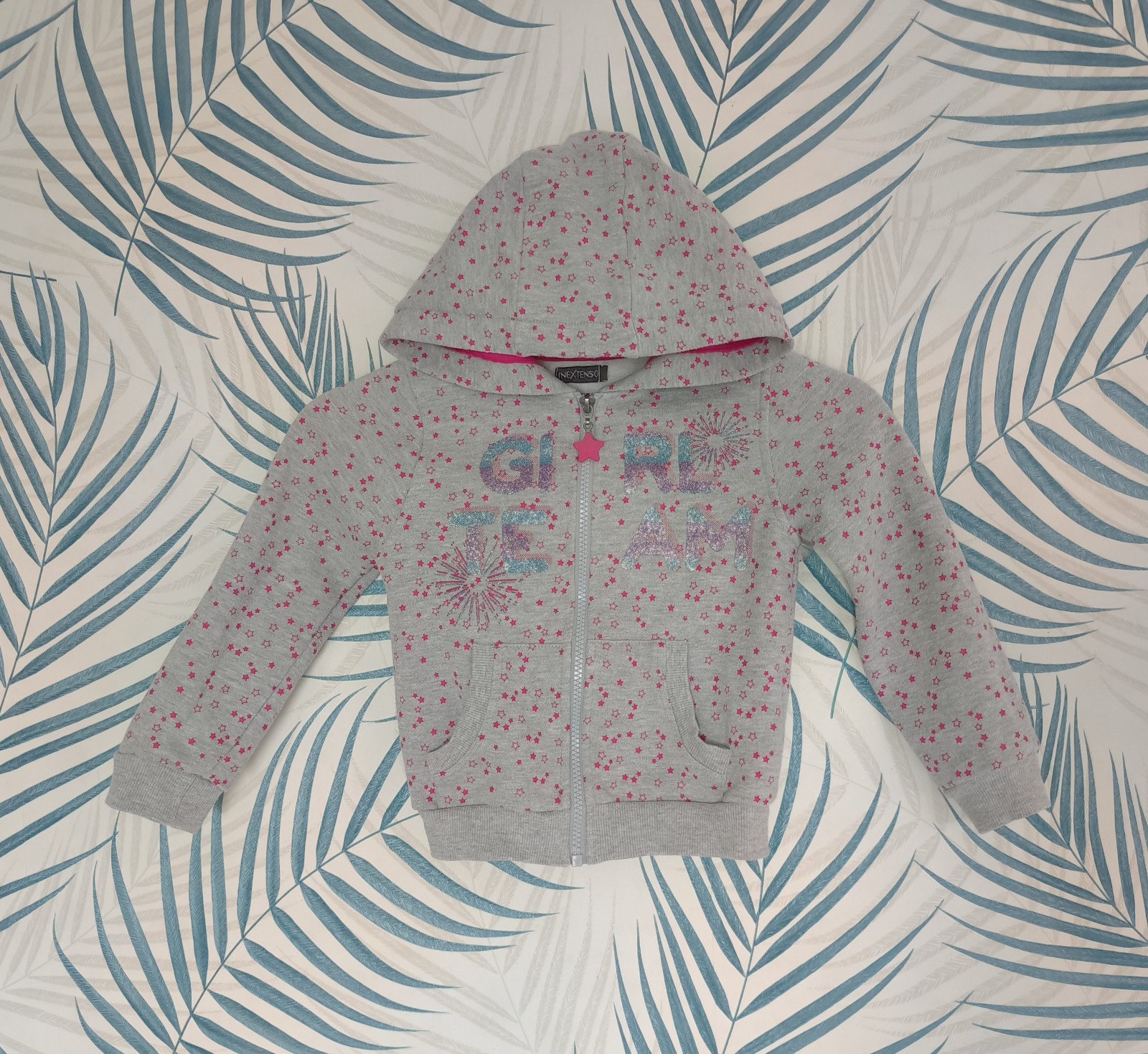 Veste sweat zippée à capuche de la marque In Extenso, - Imprimé étoiles avec flocage pailletté "Girl Team" - Ouverture zippée - Matière chaude et confortable Taille : 6 ans ℹ️ Très bon état car peu porté #sweatzippeacapuchefille6ans #fille6ans #giletfille6ans #vestefille6ans #inextenso