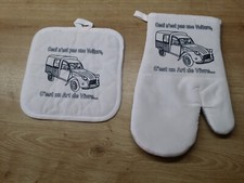 Lot de deux sets de cuisine, 2 gants et 2 maniques assorties en silicone et coton. Un set en silicone bleu dont un gant et une manique carré. Avec trous d'accroche. Un set en coton renforcé rouge dont un gant à bec et une manique double où l’on passe la main dedans.