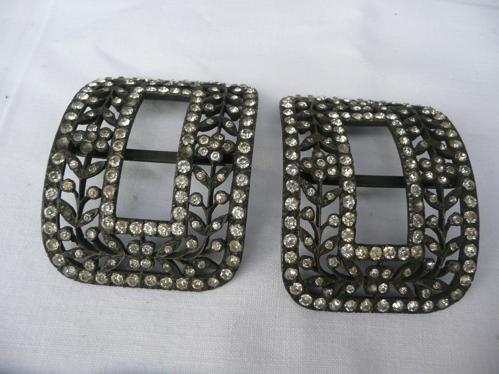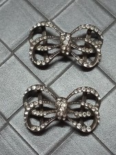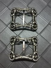 paire de boucles de chaussures ancienne en bronze argenté à décors de strass